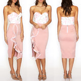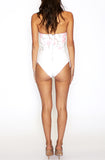 The Addison capsule revolves around a unique statement-making embroidered fabric. This strapless bodysuit features a stretchy woven lower half with our non-stretch Addison embroidery fabric from waist to bust with an exposed back zip.