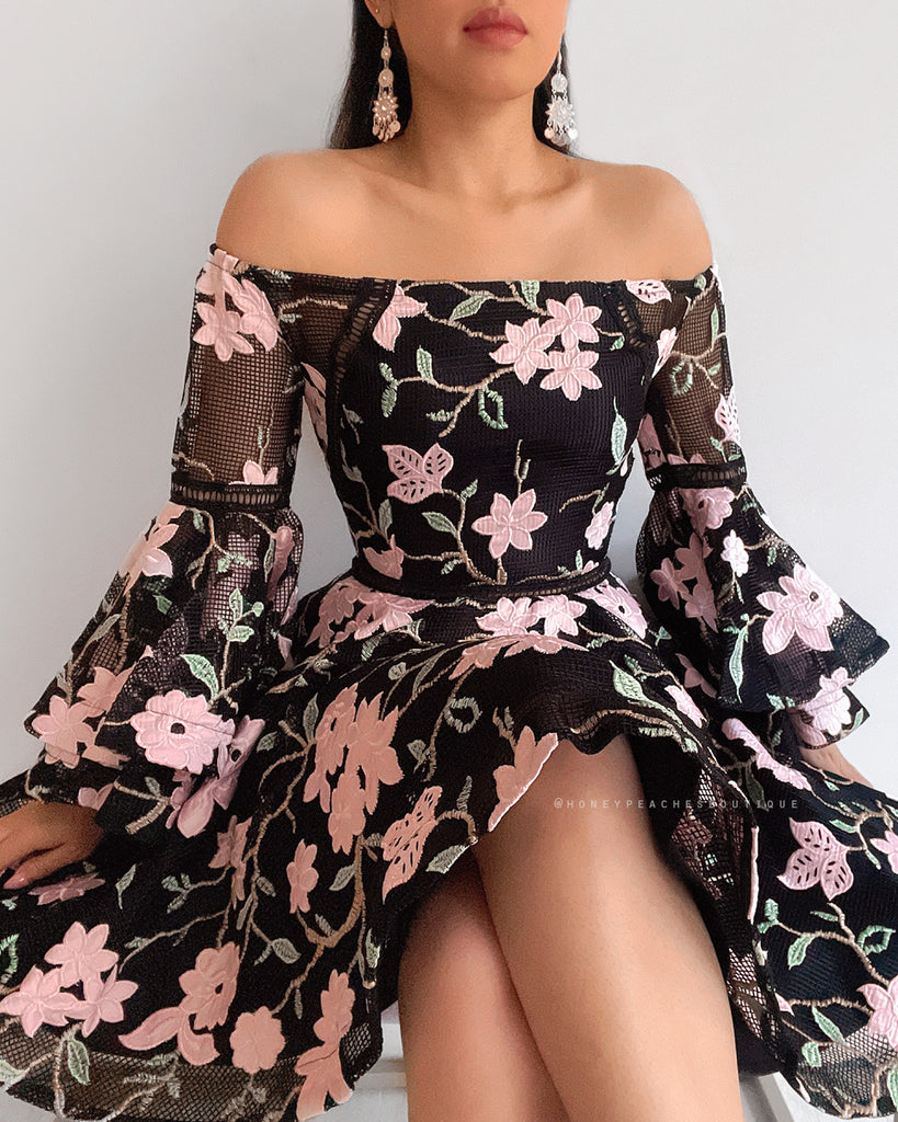 The Addison capsule revolves around a unique statement-making embroidered fabric. The flared sleeve dress is an off the shoulder frock which features oversized flared bell sleeves and flared knee length skirt