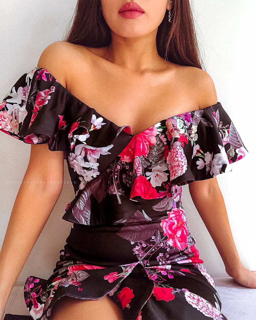 Alessandra Midi Dress - Black Floral