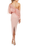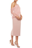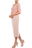 This strapless fitted dress has a light sheer off the shoulder layer attached, with below knee length hemline & optional matching belt.