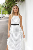 The Polly Maxi Dress features a light weight polka dot fabric, peplum detailing along the body, high neck with an adjustable tie up. Belt not included.