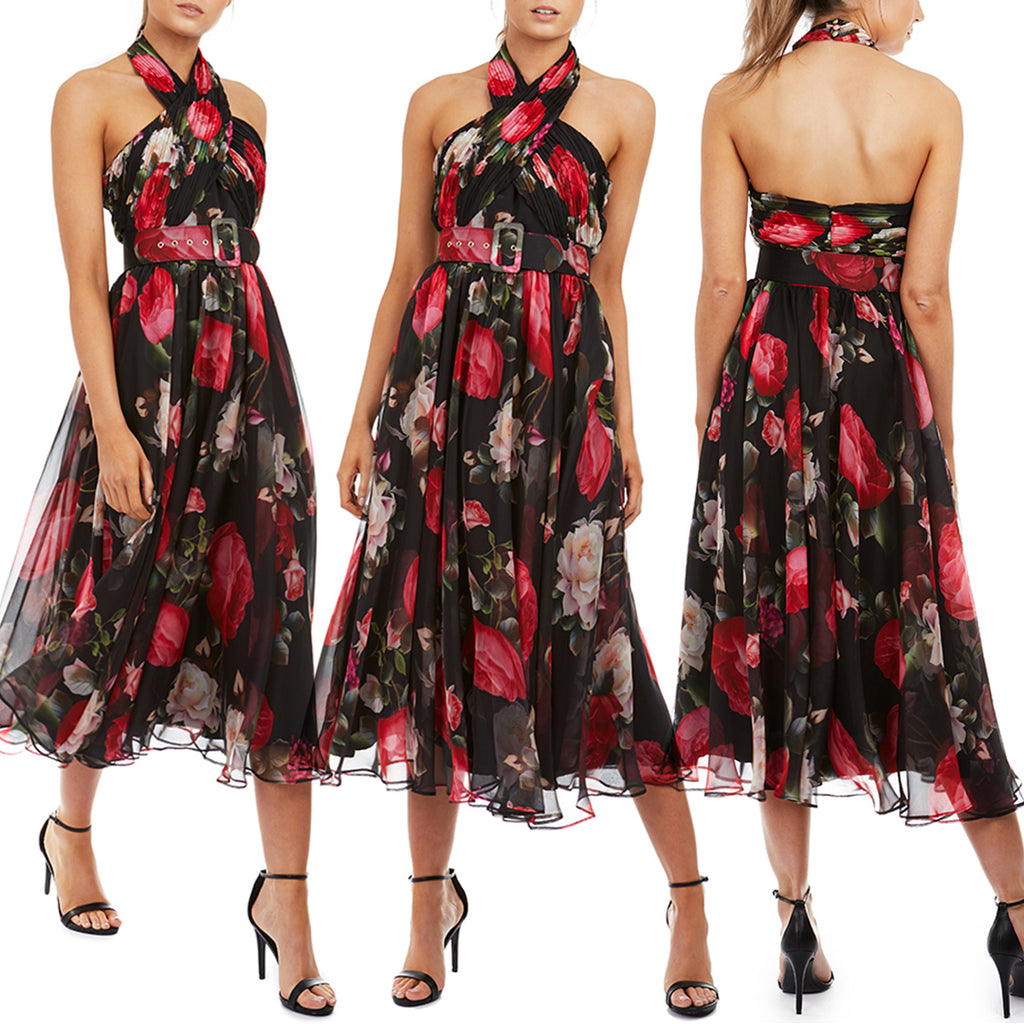 Full skirt halter dress with matching belt, this is the perfect party dress!