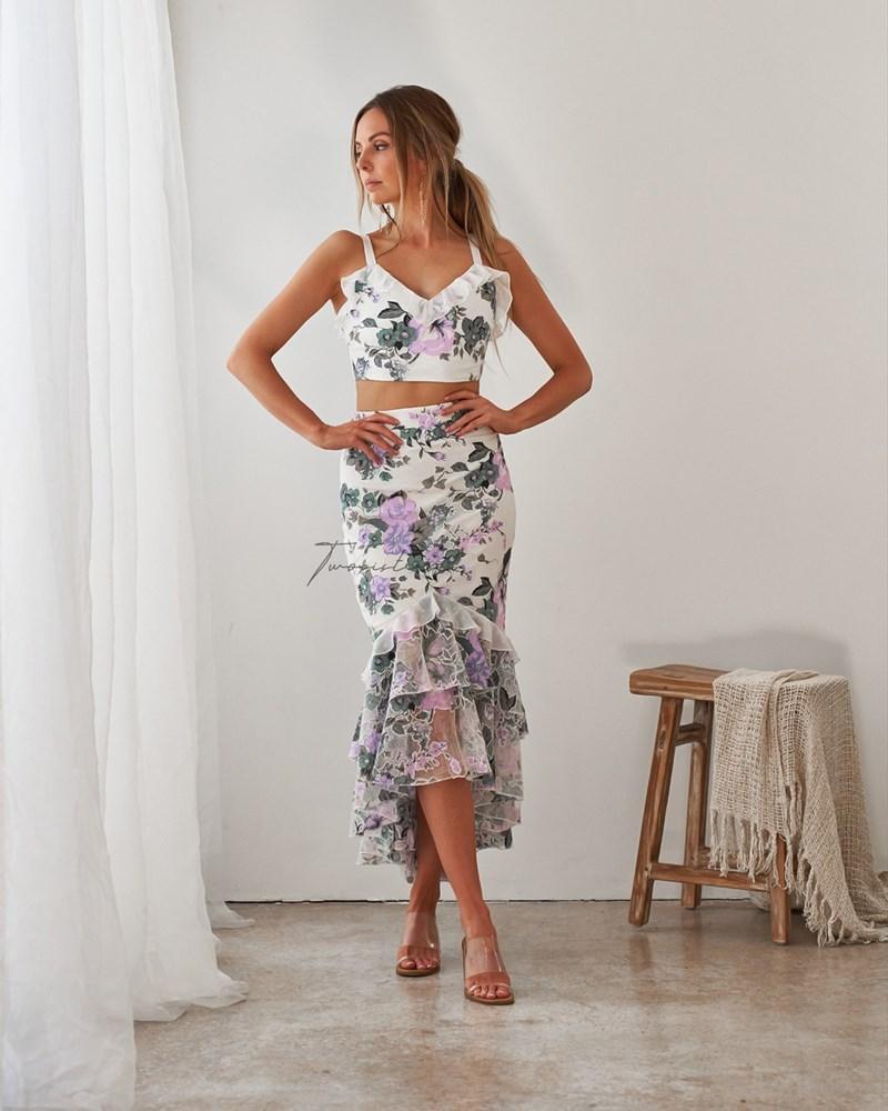 - Two piece set featuring a V-neck drop top and high-low midi skirt