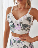 - Crop top has adjustable straps and chiffon ruffles at the neckline